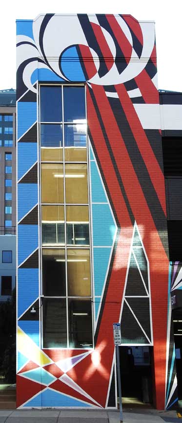 "A bold fire engine red heel breaks through the ice of the canopy over theentrance to the parking garage."