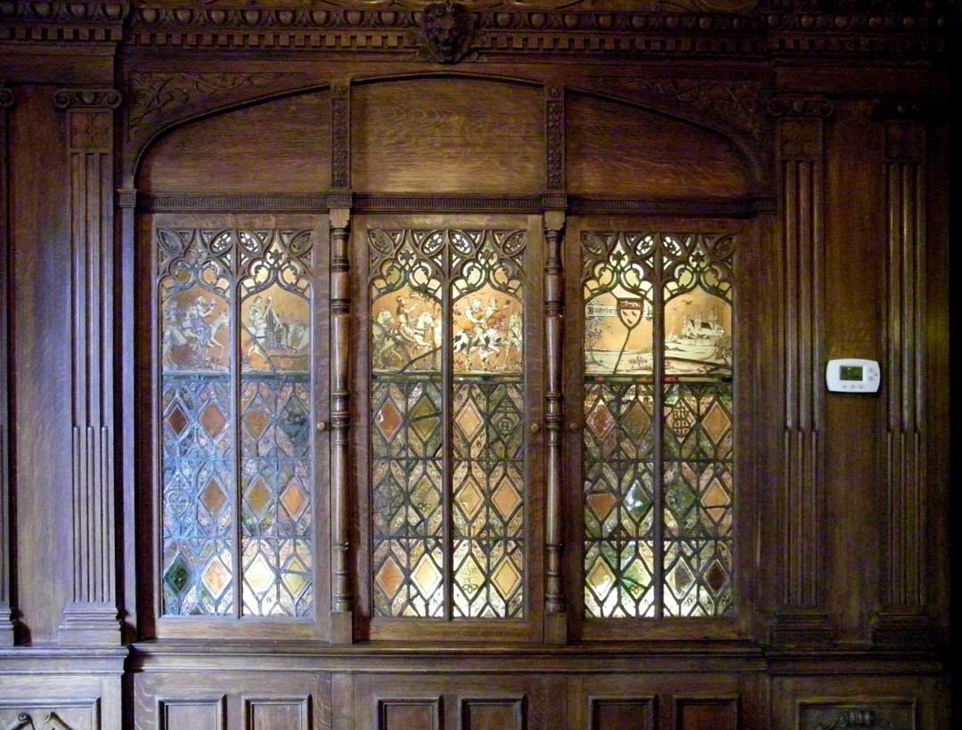 glass windows in bookcase doors. The windows, designed by Nicola D'Ascenzo Studios, depict scenes from the Canterbury Tales. There is a bookcase