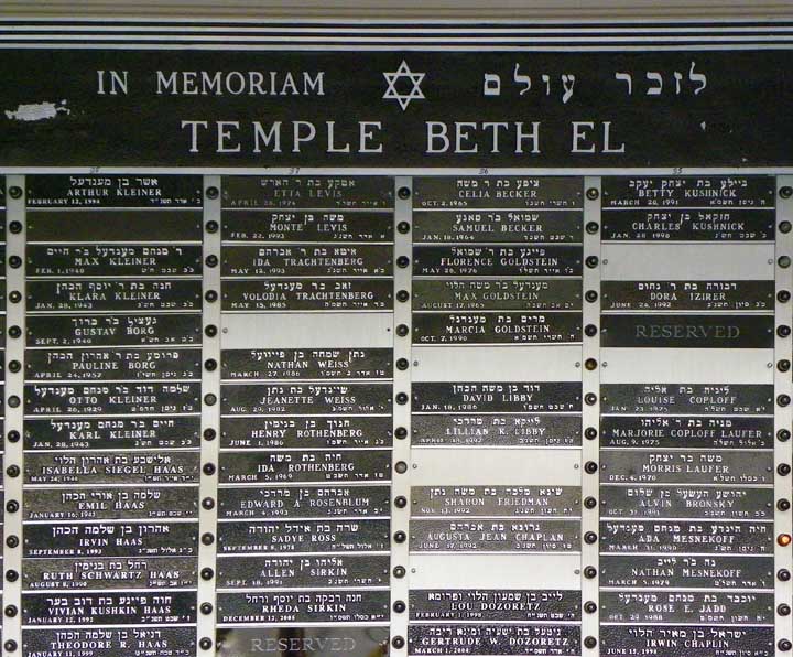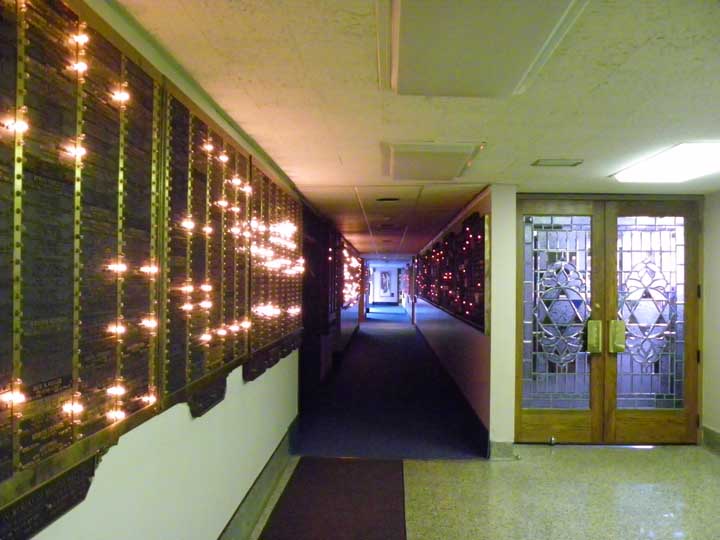 ![]() Left corridor features panels with the names of temple members. Right pair of doors, the entrance to the sanctuary: symbolic Gates of Righteousness. Sha’arey Tzedek means “Gates of Righteousness.” ![]() ![]() Panels with names of temple members. On birthdays, the light bulb next to the person's name lights up. ![]() One of the panels ![]() |
