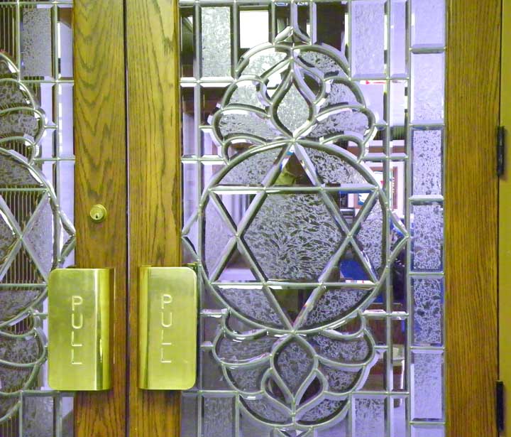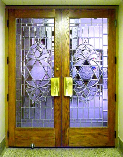 Sanctuary Doors![]() The doors are symbolically the Gates of Righteousness - Psalm 118:19-21: "Open to me the gates of righteousness: I will go into them, and I will praise the LORD: This gate of the LORD, into which the righteous shall enter. I will praise thee: for thou hast heard me, and art become my salvation." These doors are from Temple Emanu-El. In 2008, Temple Beth David-Ner Israel and Temple Emanu-El merged with the new name Temple Beth Zzedek. ![]() The doors feature beveled and glue-chipped glass. ![]() The purple in the illustration results from objects behind the glass in the sanctuary. ![]() ![]() Beveled, glue-chipped glass |