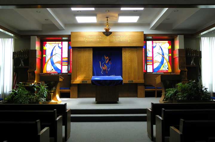 Bema![]() ![]() Stained glass windows and wooden sculptures by Ascalon Studios, West Berlin, NJ ![]() Wooden, sculpted menorah ![]() Left flanking window: Landscape trees are visible through the glass. Two window details below: ![]() ![]() ![]() Right flanking window |