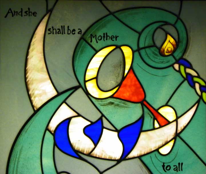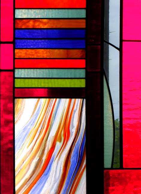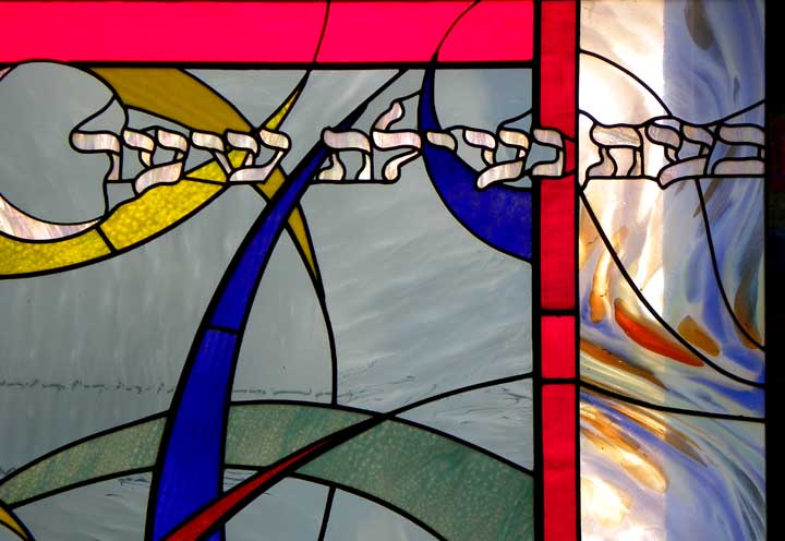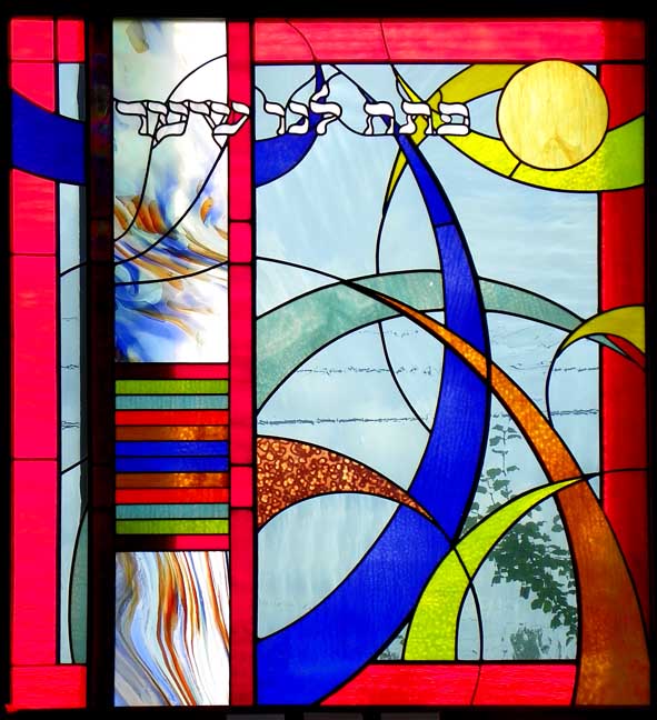 Matriarch window: Sarah, wife of Abraham By Jane Jacobson, Glass Roots Stained Glass Studio ![]() "Symbols include the Kiddish cup, Havdalah candle (marking the ceremonial end of Shabbat), the moon symbolic of the feminine, and the protective cloud of God watching over the household. " - Jane jacobson All glass is opalescent Bullseye. Two details below: ![]() ![]() |