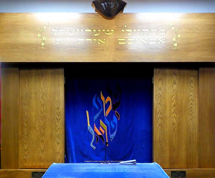 ![]() Stained glass windows: The Twelve Tribes of Israel, by Jane Jacobson, Glass Roots Stained Glass Studio. Note bema on right. ![]() Stained glass windows: The Twelve Tribes of Israel. Right pair of doors - Gates of Righteousness ![]() Stained glass windows: The Twelve Tribes of Israel, by Jane Jacobson, Glass Roots Stained Glass Studio. ![]() Men's tallits (prayer shawls) |