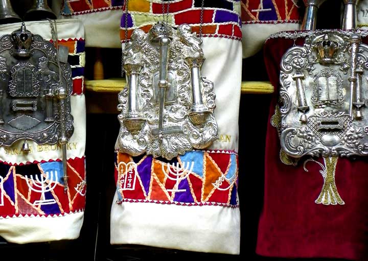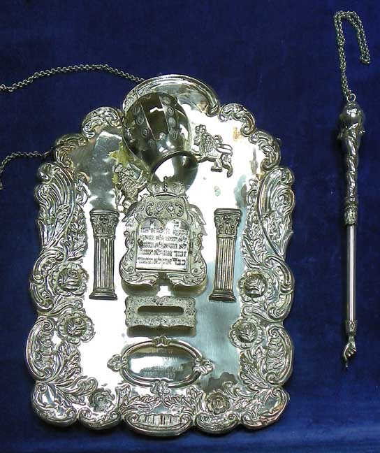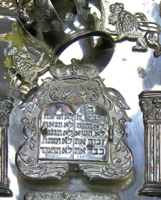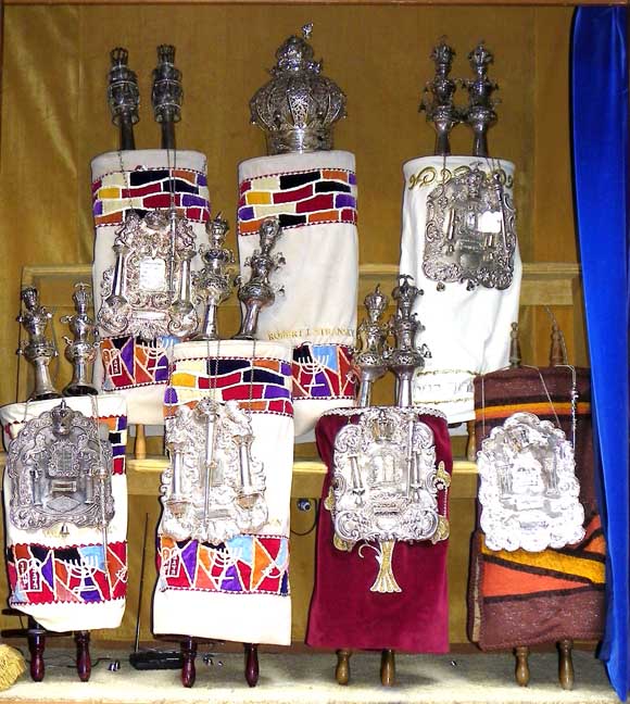 Ark![]() ![]() Top, middle: Silver kesser: Hebrew, crown. The kesser rests on the wooden shafts, which extend above the scroll.) Antique Eastern European torahs covered with mantels, silver breastplates. Torah Yad pointers. and atzei chayim (the two wooden shafts attached to either end of the Torah scroll). ![]() ![]() ![]() Left: Torah breastplate features lions Right: Torah Yad pointer. A Torah Yad pointer is a pointer, in the shape of a long stick, which usually has a hand with a finger at the end. It is made for the Ba'al Koreh (the Torah reader) to point out the words that he is reading from the Torah (5 Books of Moses) on the Shabbat and Mondays & Thursdays when the Torah is read in the Synagogue.) ![]() Torah text example. Waviness a result of camera lens distortion. |