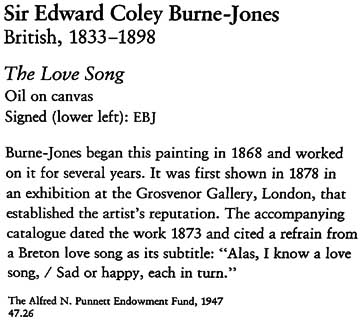 This painting is the definitive version of several works that Burne-Jones based on a refrain from an old Breton song: "Hélas! je sais un chant d'amour, / Triste ou gai, tour à tour" (Alas, I know a love song, / Sad or happy, each in turn).