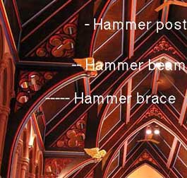 In order to give greater height in the center, the ordinary tie beam is cut through, and the portions remaining, known as hammer beams, are supported by curved hammer braces from the wall.
