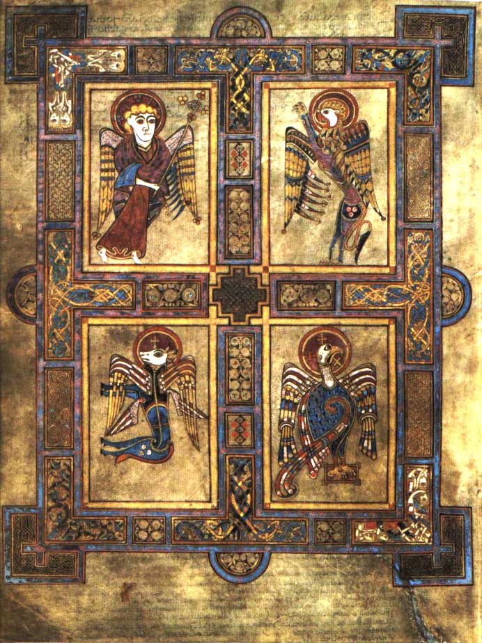 Evangelists![]() Four Evangelists in the Book of Kells ... Book of Kells Upper left: Matthew (winged man) ... Upper right: Mark (winged lion) ... Lower left: Luke (winged ox) ... Lower right: John (winged eagle) Photo source: Public Domain / Wikimedia Commons |