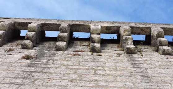 In fortifications a balcony or walkway projecting from the face of the wall. The floor of the projecting area contains openings enabling the defenders to drop items onto the attackers below.