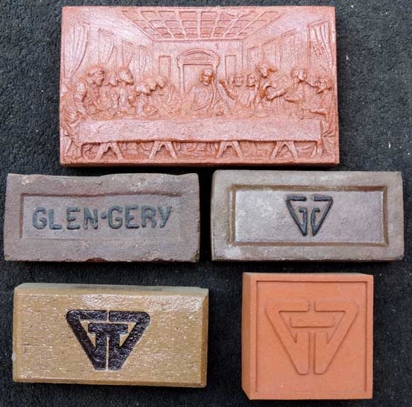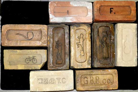 Top brick depicts polo stick ... 1 of 3 known Bicycle bricks ... 2 band leader depictions ... Bottom left brick: Wisconsin, Brick, Union symbol, Tile Co. ... Bottom center and right: facing women with parasol