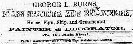 - "Burns was born in Burlington, Vermont in 1820 and moved to Buffalo when he was 16. After working for Buffalo Stained Glass Works he opened his own studio in 1851 ... marketed heavily in the Great Lakes region and Episcopal publications in the late 1850s. With the Civil Was he focused on just the Episcopal publications and New York State ... Burns had a stroke in 1870 that effectively ended his career."- Greg Witul