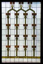 ![]() Grisaille, grissaille (gri ZEYE, ZAIL) Window or panel or ornamental designs, composed almost exclusively of uncolored glass in which the designs are created by the black leads alone or with the addition of paint and silver stain (below). Monochrome painting on glass using a mixture of ground glass, ground lead and other substances. The word is derived from the French "grisailler," meaning to paint gray. Decorative work or illustrative scenes rendered mainly in shades of gray (or muted brown). Grisaille is the use of black enamel to create patterns on clear glass that was then refired. Grisaille is a lacy (foliate) pattern painted on light glass with vitrifiable paint (able to be fired and turned into glass) and fired. Grisaille usually include either foliate (oak, maple, rose, etc.) or geometric (usually strapwork) patterns. Strips of color were sometimes added to the monochrome of grisaille. Toward