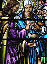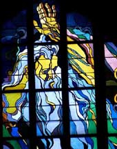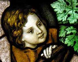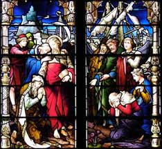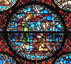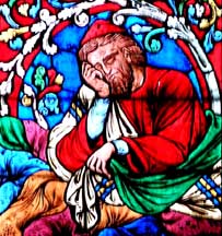 Flashed glass is one sheet of glass made of two layers of color. Any color can be flashed on top of another. Made by dipping a ball of semi-molten (below) white ("colorless") glass into molten colored glass which, when blown (below) and flattened, results in a less intense color because it will be white on one side and colored on the other. In the Gothic era, natural pot-metal (above) glass colored blue or red was too dark to transmit much light, so the medieval glazier (above) hit on the technique of flashing. A semi-molten cylinder of colorless ("white") glass was dipped into a pot of red glass so that the red glass formed a thin coating. This allowed a variety in the depth of red, ranging from very dark and almost opaque (below), through ruby red to pale, and sometimes streaky red that was often used for thin border pieces. The red of double-layered glass could be engraved or scraped to show colorless glass underneath. The original color thus revealed could be either left in its original state or painted. This affected the size of individual pieces of glass, which now became much larger and less geometrical. Only one section was now needed for a face, its hair, and the surrounding halo, instead of the previous three. In the late medieval glass this method was often employed to add rich patterns to the robes of saints. You can easily tell a piece of flashed glass by scratching at a corner with a glass cutter or just chipping a small bit away. The underlying color will show through. A great deal more light can pass through a window containing grisaille and/or flashed glass, which means that dark interiors can be illuminated much more efficiently.