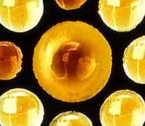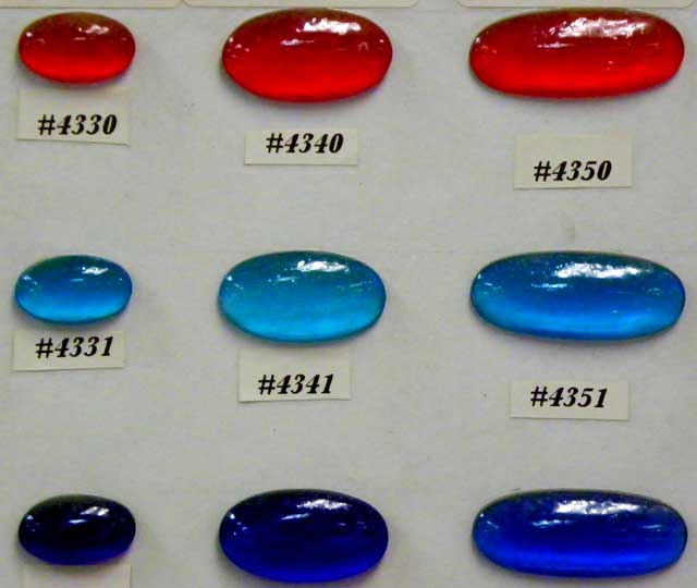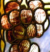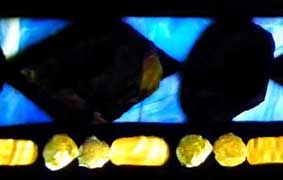 A small, compact chunk or clump. A lump, or irregularly shaped mass, A small, irregularly shaped "glob" of glass, flat on the bottom, rounded across the top. Nuggets are made by literally dropping a small amount of molten glass onto a flat surface. Frequently called "globs," they are often incorporated into leaded glass artwork. Often used to replace smaller round pieces in a design, such as grapes in a cluster, a flower center, or to add dimensional interest to a piece. Sizes range from 1/4" to up to 2" in diameter and come in a variety of cathedral (above) and opal (below) colors. Both John LaFarge and Louis Comfort Tiffany used irregular nuggets, chipped and fractured wih a hammer - usually calledjewels (above).