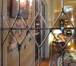 ![]() Saddle bars The round support bars on a stained glass window. They are attached to a stained glass panel with copper wire that has been soldered on to lead joints (where one piece of lead meets another) and then the ends are twisted firmly behind the bar to hold the panel in place. The flat support bars are called fins. They should be soldered directly to the stained glass panel at all possible lead joints. Both saddle bars and fins should be attached to the sash as well as the panel, otherwise, it's just a piece of metal attached to the window, not supporting it. Booklet available for purchase: Stained Glass Association of America, "Standards and Guidelines for the Preservation of Historic Stained Glass" |
