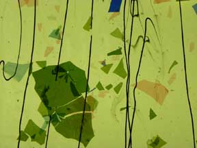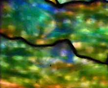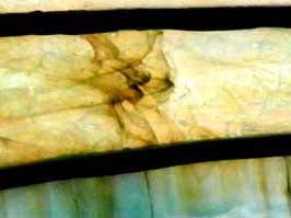 Streakies Sheets of colors streaked across the surface. They are similar in this to opalescent (above) glass, but being transparent (below) they have a delicacy and imprcssiveness that can be breathtaking when the light streams through. Many of the English Strcakies, in addition to combining wide ranges and flow of colors, also add a rippling (above) of the glass itself - a textural component that makes the colors simply dance across the sheet. Streakies are particularly effective when used in windows as sunsets, cloud-filled skies, ocean waves, landscapcs, mountains, or rainbows. |