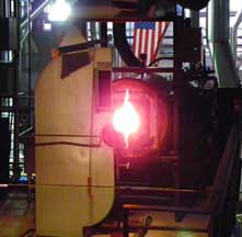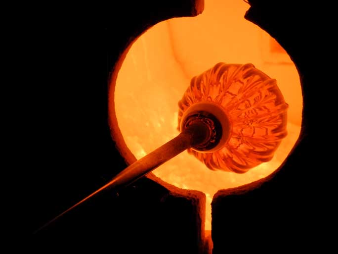 The art of shaping a mass of glass that has been softened by heat by blowing air into it through a tube. A glass forming technique that involves inflating the molten glass into a bubble, or parison, with the aid of the blowpipe, or blow tube. A person who blows glass is called a glassblower, glassmith, or gaffer. His reheating furnace is called a "glory hole" (below). The discovery of glassblowing was made somewhere around the year 50 BC by the Romans. Most early stained glass was made by mouth-blowing long cylinders of molten glass, which were partly cooled, had the ends removed, were cut open, reheated and flattened. See pot metal below. |