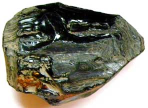 Most obsidian is 70 percent silica (sand) - just like modern factory-made stained glass used for windows. Obsidian can come in many different colors including dark green, dark brown, black, golden sheens, beautiful yellows, blues, and tinges of purple. Iron and magnesium typically give the obsidian a dark green to brown to black color. Obsidian can also come with small white inclusions made from cristobalite. These small white crystals look very similar to snowflakes and are called Snowflake Obsidian. Its splinters are often transparent (below) or translucent (below). It is a naturally occurring volcanic glass that was the first form of natural glass used by humans. In the Stone Age, it was fractured to produce sharp blades or arrowheads. Today, obsidian glass is used to make scalpel blades used in cardiac surgery. The obsidian used as the illustration was purchased from Past and Present.