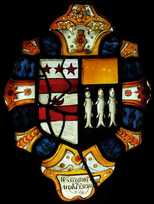 This window (one of a pair), with the coat of arms of George Washington's ancestors, was in Sulgrave Manor in England for several centuries President Washington descended seventh in line from Laurence Washington, who bought the manor from King Henry Viii in 1539.
