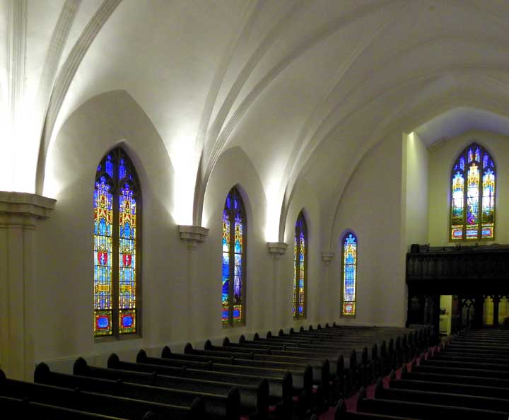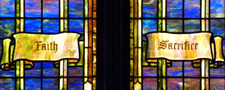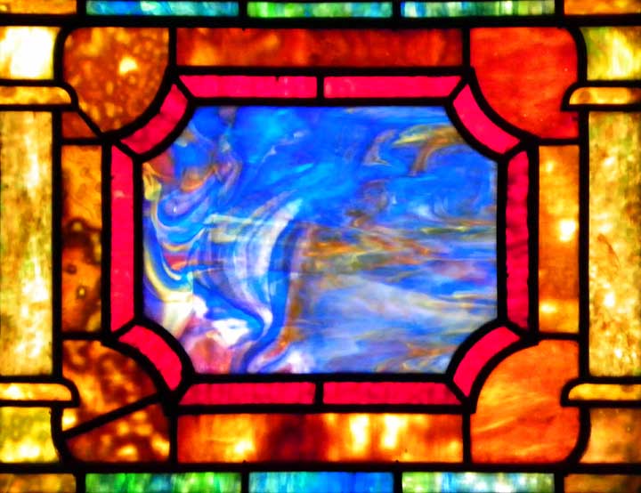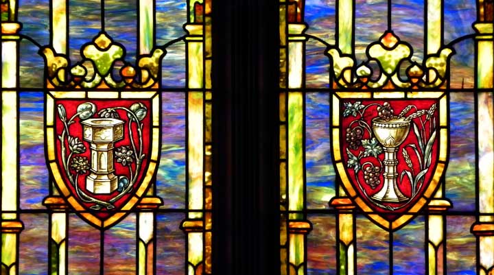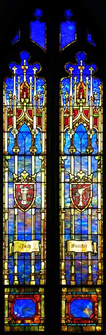 ![]() Photo taken from the chancel. At left is the east side of the nave which includes three 2-panel stained glass windows. There are three corresponding windows on the west side of the nave. The middle figural window on each side of the nave is signed. There are two identical geometric windows on the front of the church, and a figural window in the organ loft. Faith and Sacrifice ![]() ![]() Faith symbol: Baptismal font reminds Christians how they became Christians Sacrifice symbol: Chalice with grape vines recalls the Last Supper before Jesus' crucifixion ![]() ![]() Opalescent glass with some mottled stained glass |