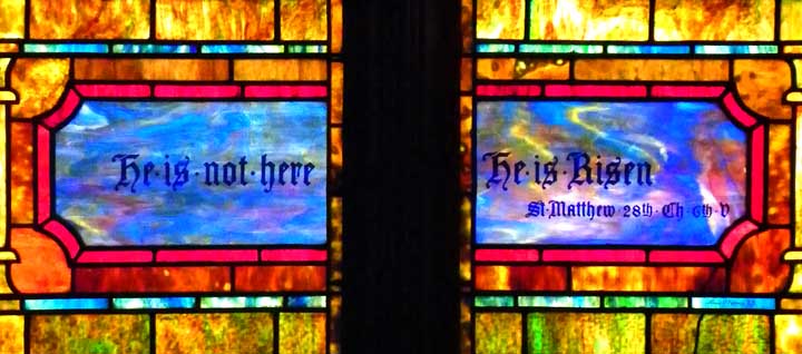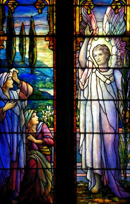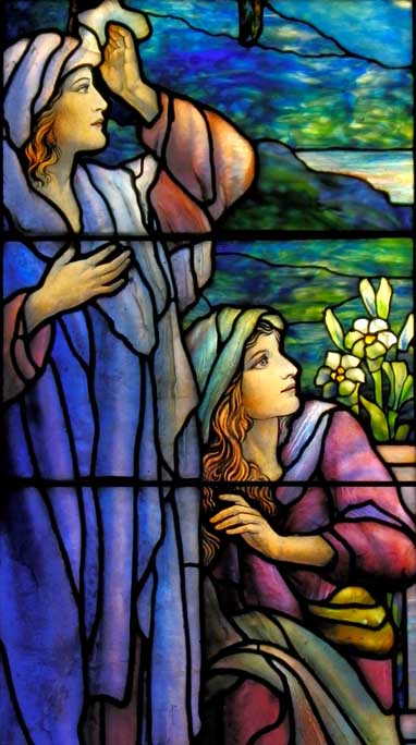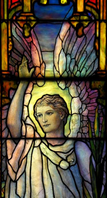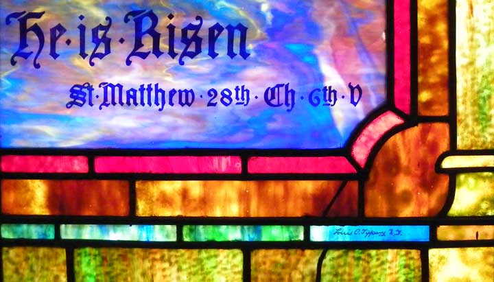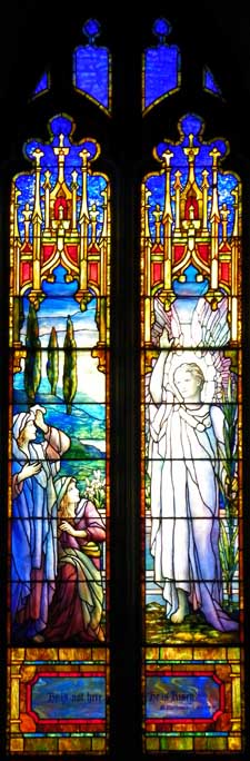 'He is Not Here. He is Risen.'![]() Resurrection: An angel tells Mary Magdalene and Mary, wife of Cleophas, "He is not here. He is risen." The architectural canopies frame the figures that might otherwise appear to float in space. ![]() ![]() Mary Magdalene and Mary, wife of Cleophas ![]() ![]() "He is not here. He is risen." Note signature in lower right ![]() ![]() Signature: Louis C. Tiffany, N. Y. |