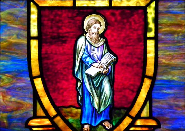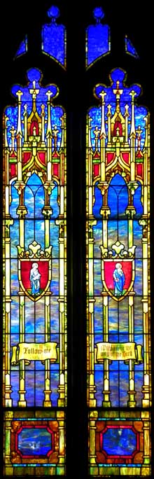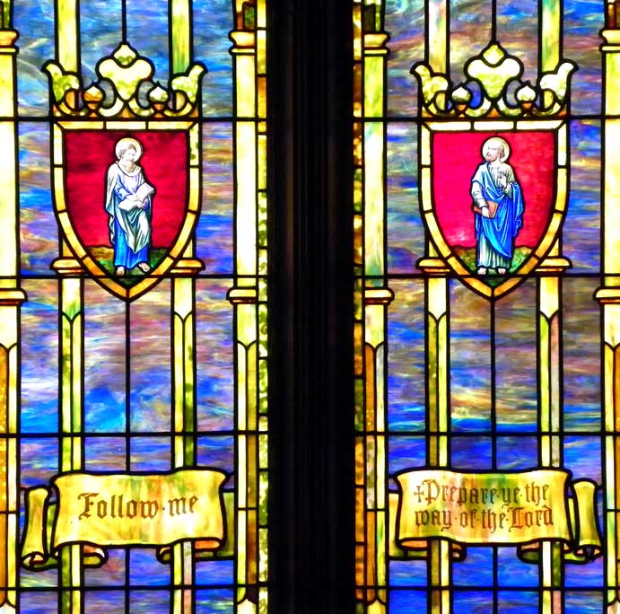 Evangelists Matthew and Luke![]() Left: Evangelist Matthew ..... Right: Evangelist Mark On the west side of the nave are the counterparts Luke and John. ![]() Left: Evangelist Matthew - "Follow Me" is Jesus' calling to Matthew. Right: Evangelist Mark - "Prepare Ye the way of the Lord" is the beginning of Mark's Gospel ![]() Evangelist Matthew ![]() Evangelist Mark |