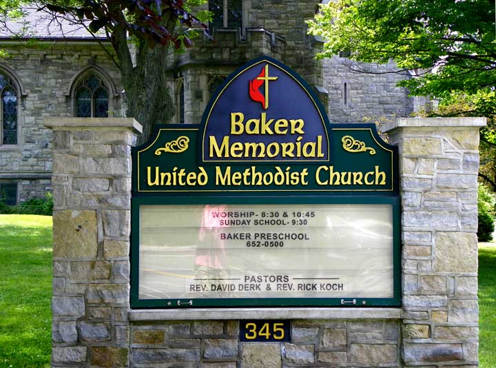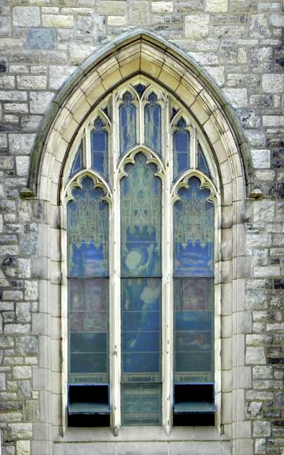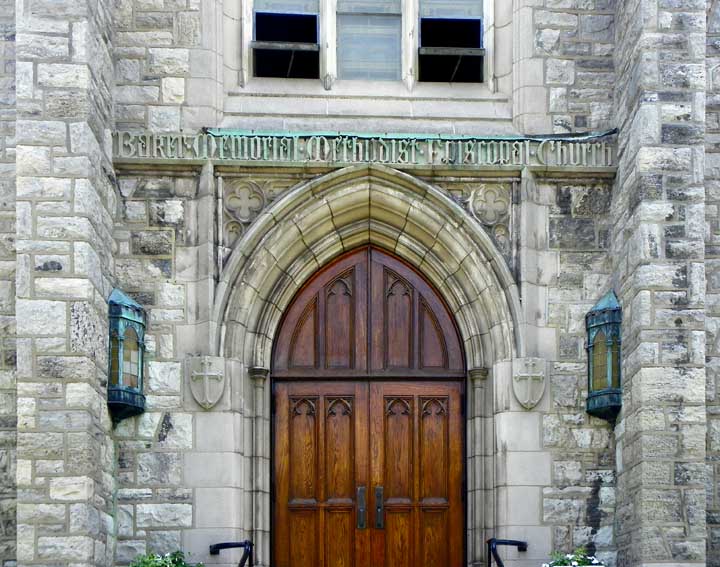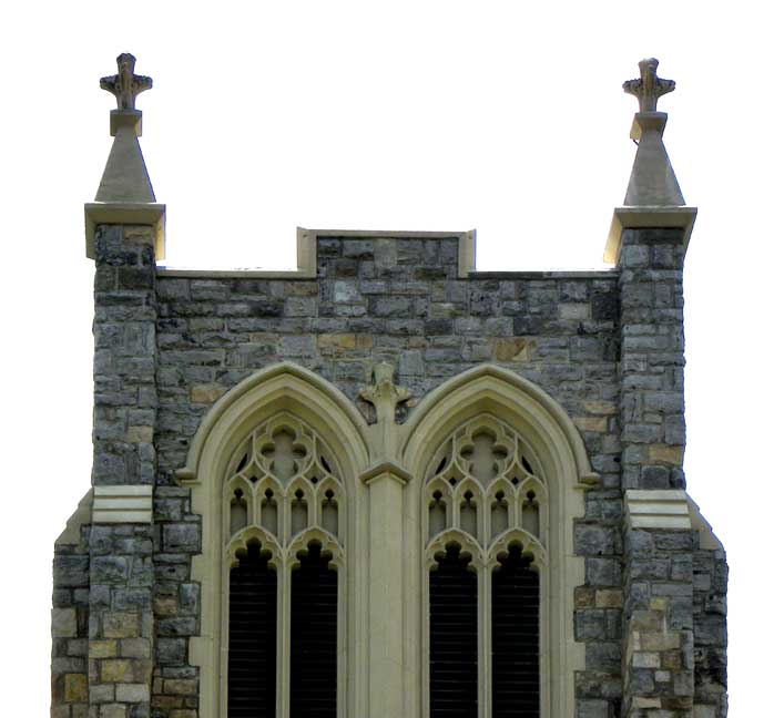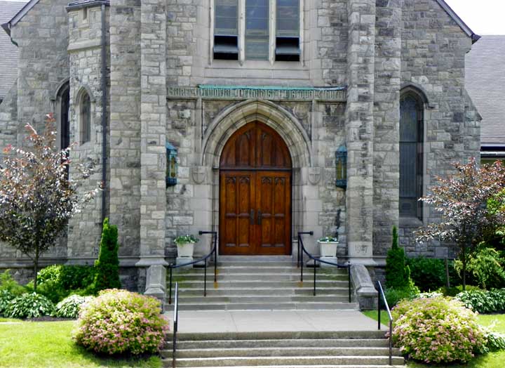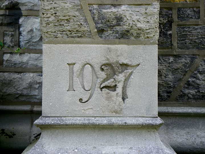 1928 church![]() East and north (facade) elevations ![]() Facade ![]() Crenelated tower with corner finials ![]() Protective covering clouds Tiffany stained glass window ![]() ![]() Compound pointed Gothic arch ![]() Cornerstone ![]() |
