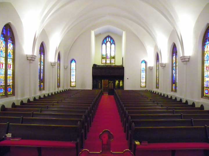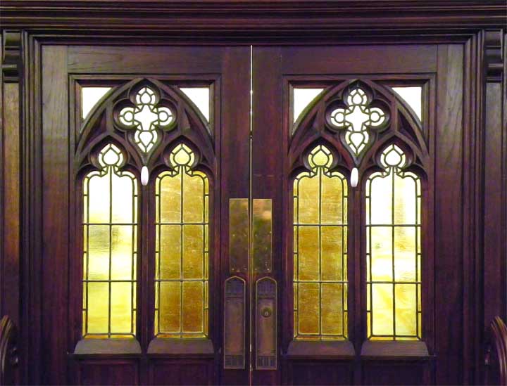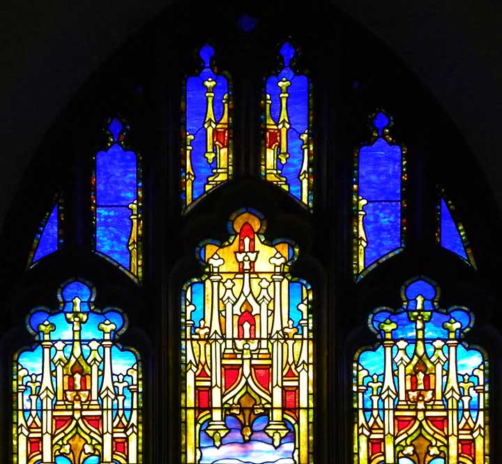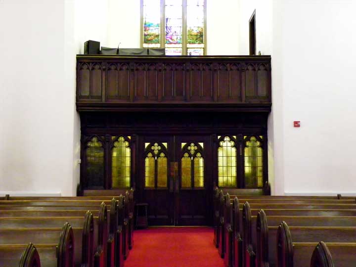 ![]() Photo taken from the chancel. At left is the east side of the nave which includes three 2-panel stained glass windows. There are two identical geometric windows on the front of the church, and a figural window in the organ loft. ![]() Oak ![]() Quatrefoil and trefoil shapes in tracery |