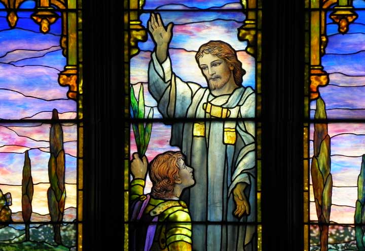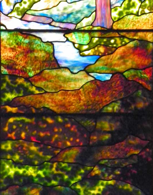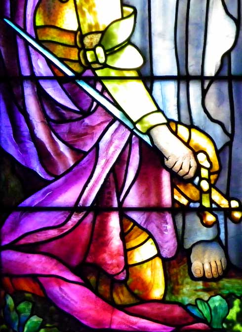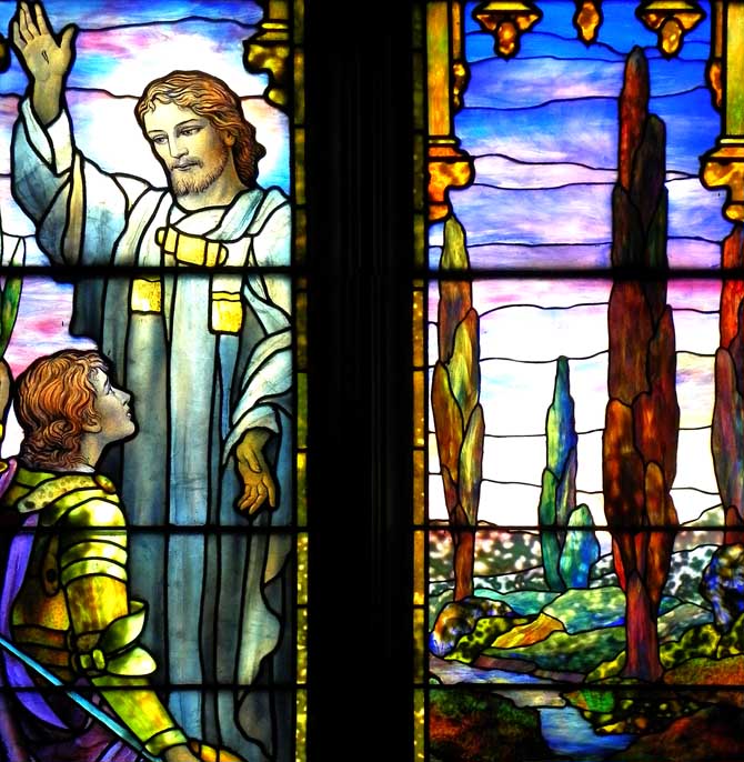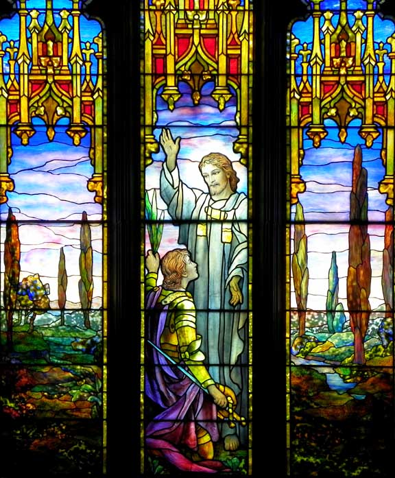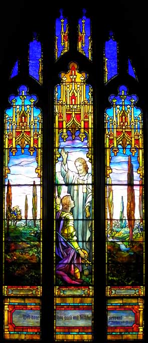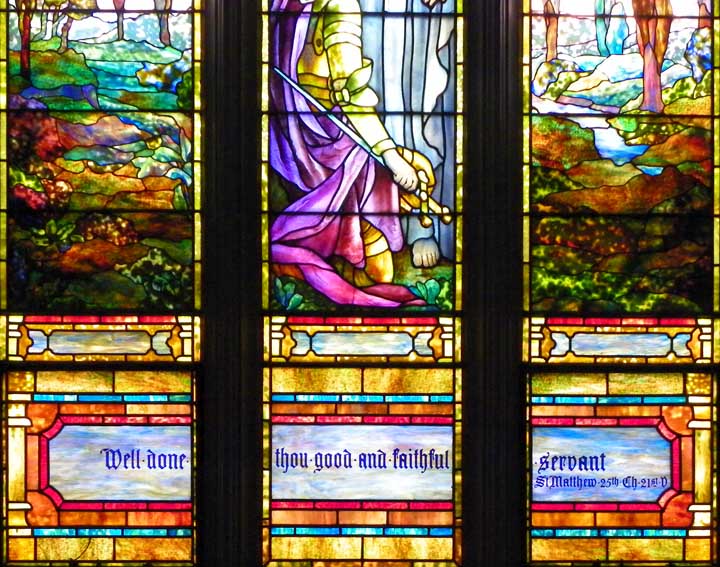 ![]() 'Well Done Thou Good and Faithful Servant.' ![]() Pinnacles topped by finials ..... Pendant finials ![]() Border and sky depicted with opalescent glass ![]() Face and hands are enameled; scenery depicted with opalescent glass ![]() Note use of mottled stained glass in lower right in photo above and also in the two side panels in photo below. ![]() A liberal interpretation of Matthew 25:14-21 ![]() ![]() Mostly mottled stained glass |