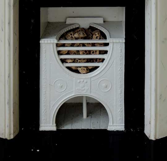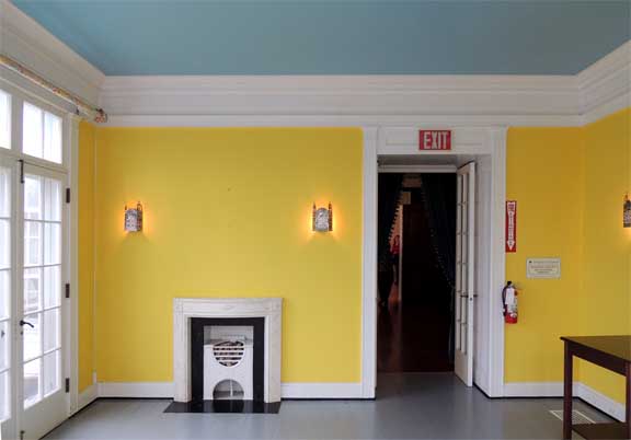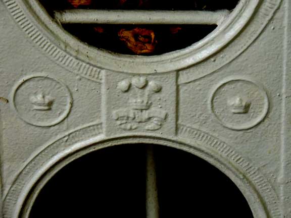 Breakfast room ![]() Breakfast room. Note paired sconces and fireplace, all illustrated below in detail: ![]() Breakfast room One of a pair of tin sconces ![]() Breakfast room. Fireplace. ![]() Breakfast room. Fireplace. ![]() Breakfast room. Fireplace: cast iron paired crowns flank Prince of Wales feathers |