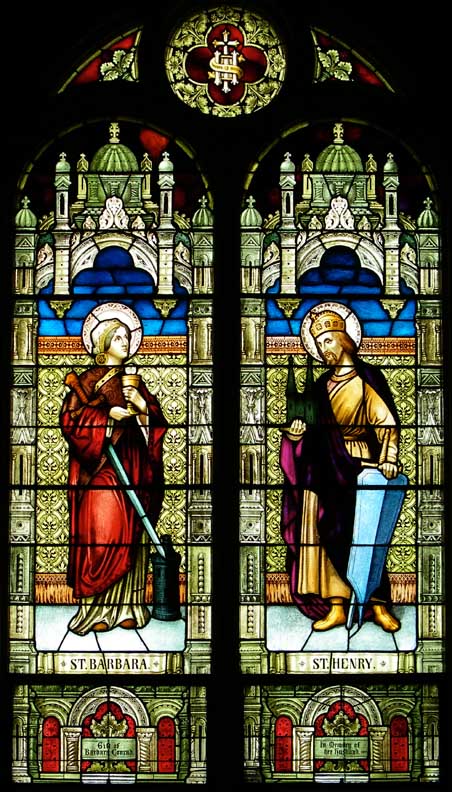 St. Barbara / St. Henry Saint Barbara is perhaps best known as the patron saint of artillerymen, military engineers, miners and others who work with explosives because of her old legend's association with lightning, and also of mathematicians and architects. See Iconography in Art and Architecture: Saint Barbara Saint Henry II the Lame (973-1024) was the fifth and last Holy Roman Emperor of the Saxon dynasty. He was crowned King of Germany in 1002 and King of Italy in 1004. He was the only German king to be canonized. See Iconography in Art and Architecture: Saint Henry II the Lame LARGER SIZE beneath top photo |