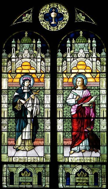 | St. Rose of Lima / St. John the Evangelist Rose was born in Lima, Peru Her nickname "Rosa" was a testament to her holy ties. See Iconography in Art and Architecture: Saint Henry II the Lame Note similarity to the St. Rose of Lima window in St. Louis RC Church Christian tradition says that John the Evangelist was one of Christ's original twelve apostles. See Iconography in Art and Architecture: St. John the Evangelist LARGER SIZE beneath top photo |