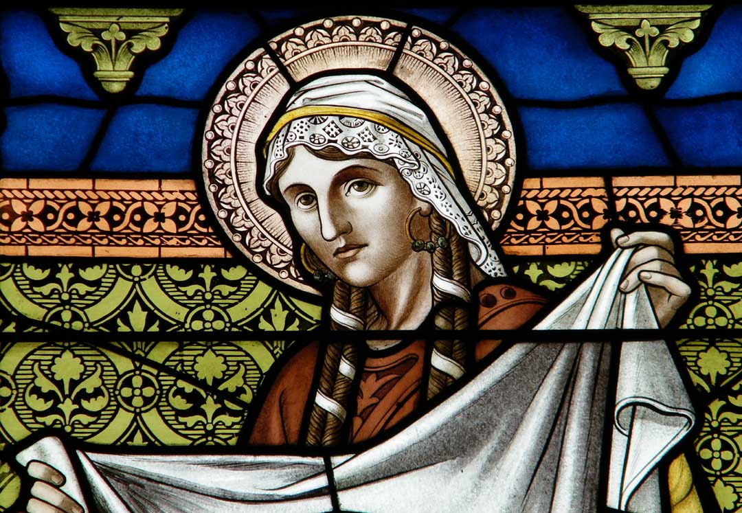 Saint Veronica - Detail Saint Veronica is not in the Bible. The most recent version of the legend recounts that Veronica from Jerusalem encountered Jesus along the Via Dolorosa on the way to Calvary. When she paused to wipe the sweat off his face with her veil, his image was imprinted on the cloth. The event is commemorated by one of the Stations of the Cross. See Iconography in Art and Architecture: Saint Veronica LARGER SIZE beneath top photo |