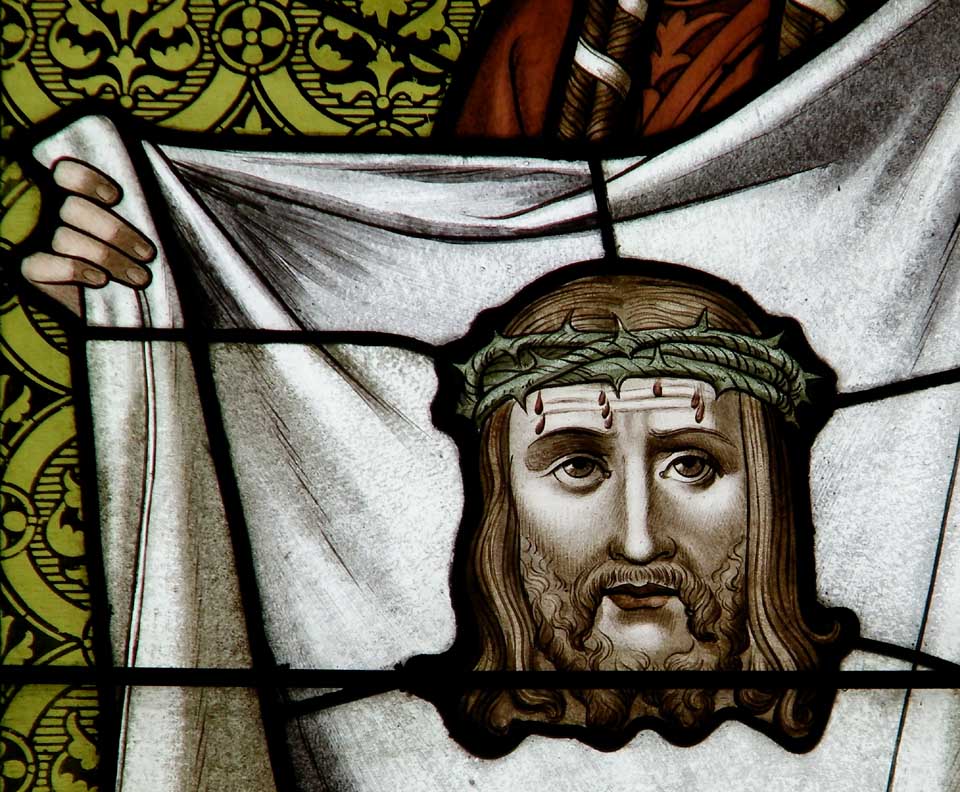 Saint Veronica - Detail Veronica from Jerusalem encountered Jesus along the Via Dolorosa on the way to Calvary. When she paused to wipe the sweat off his face with her veil, his image was imprinted on the cloth. See Iconography in Art and Architecture: Saint Veronica LARGER SIZE beneath top photo |