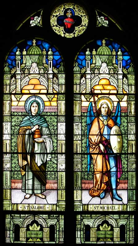 St. Salome / St. Michael St. Salome was the wife of Zebedee and mother of James and John (Matt. 27: 56; cf. Matt. 20: 20), one of the women from Galilee who was present at the crucifixion (Mark 15: 40) and came to the tomb (Mark 16: 1) and received the message that Jesus had been raised. See Iconography in Art and Architecture: Saint Salome St. Michael is an archangel in Jewish, Christian and Islamic tradition. He is viewed as the field commander of the Army of God. He is mentioned by name in the Book of Daniel, the Book of Jude and the Book of Revelation. In the English epic poem Paradise Lost by John Milton, Michael commands the army of angels loyal to God against the rebel forces of Satan. Armed with a sword from God's armory, he bests Satan in personal combat, wounding his side. See Iconography in Art and Architecture: Saint Michael LARGER SIZE beneath top photo |