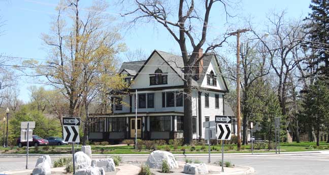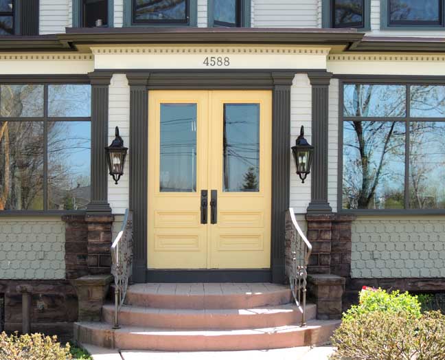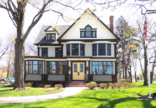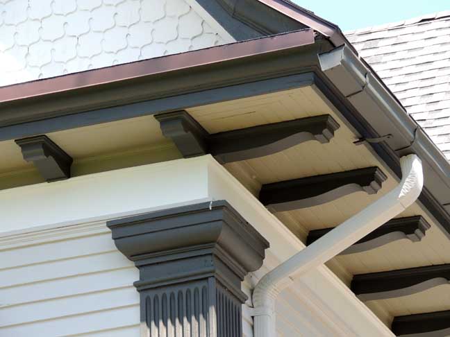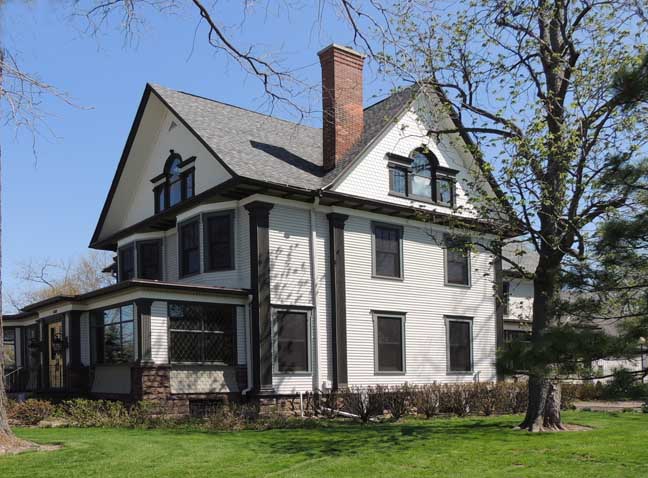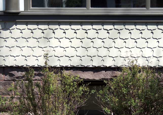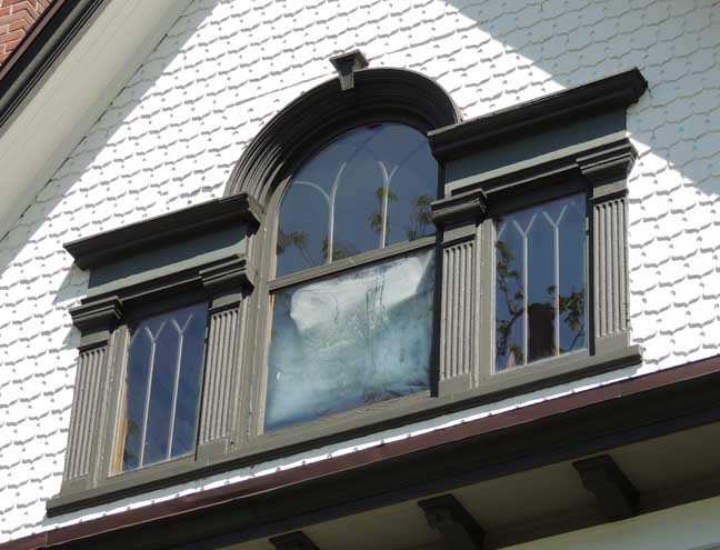 ![]() ![]() Queen Anne feature: differing wall textures, including Medina sandstone and patterned wood shingles ![]() Palladian window in attic gable. ![]() Note leaded windows and shoulders in window surrounds ![]() Queen Anne brackets and fluted Tuscan column ![]() Front entrance |
