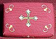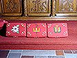 Memorial needlepoint cushion on prie dieu. Placed upright to better viewing |