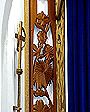 Side panel detail: descending dove representing the Holy Spirit; Advent rose |