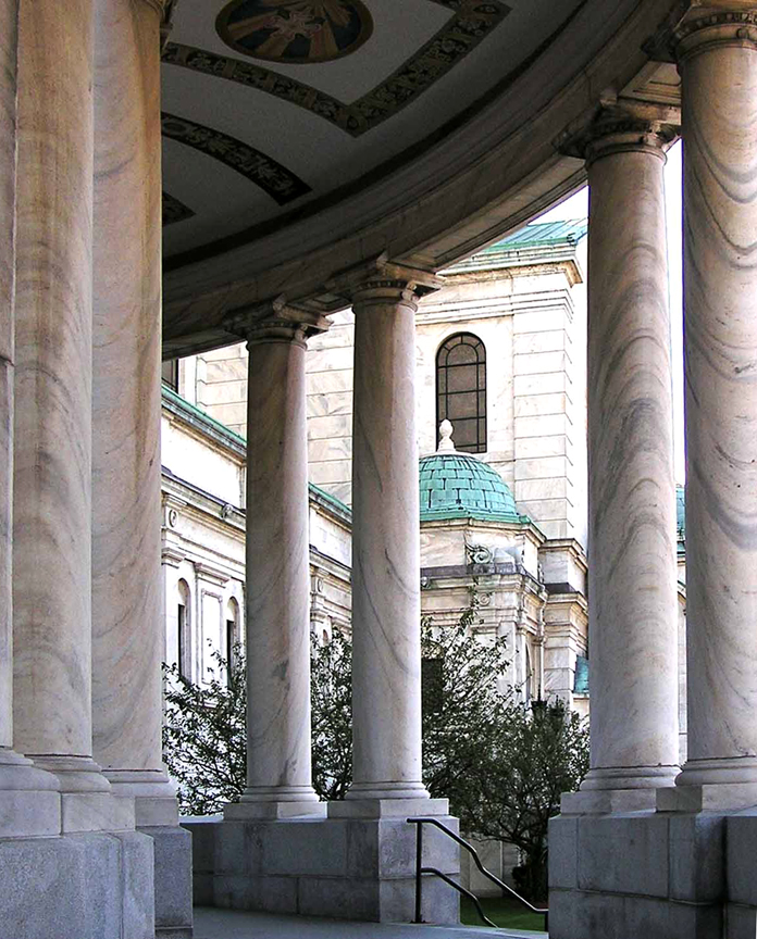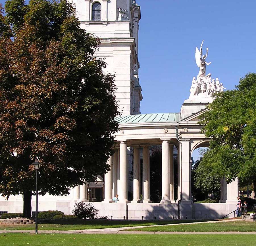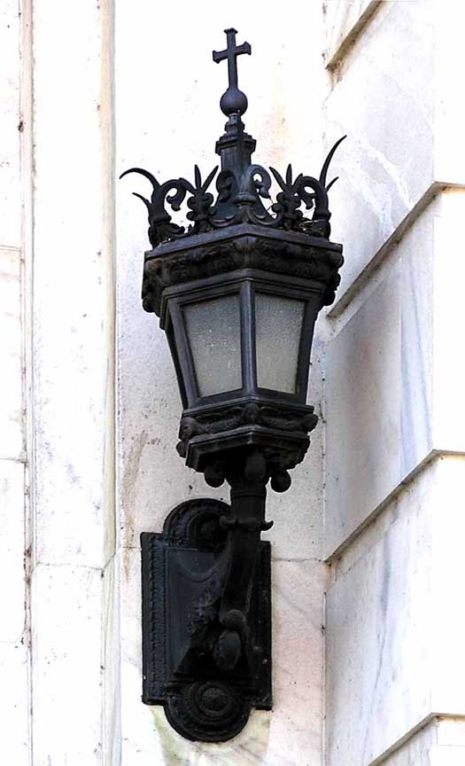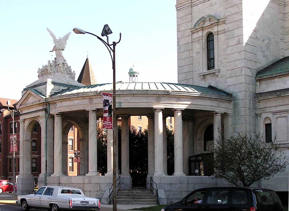 South Park Avenue ![]() Left colonnade (when facing the Basilica's front) ... Topping each of twin colonnades is a marble sculpture of a group of children overseen by a large angel ... Colonnade imitates St. Peter's Basilica in Rome ![]() ![]() Looking through right colonnade ![]() South Park Ave. entrance ... Swan's neck pediment, including cartouche ![]() South Park Ave. entrance Baroque style sconce ![]() View from South Park Avenue |