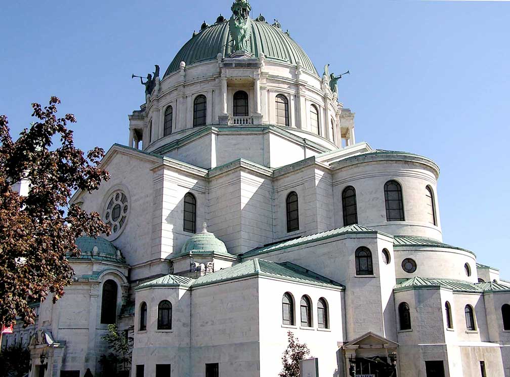 Facade![]() East elevation and facade ![]() ![]() Facade ... Two towers with copper cupolas ... Arched niche with statue ... Main entrance portico ![]() Top: Finial atop the lantern ... Middle: Copper cupola ... Bottom: Marble drum ... The most prominent feature of the Basilica's exterior is the huge copper dome / cupola. ... Measuring in at 165-feet in height, the dome, at the time of its completion, was second in size only to the U.S. Capitol building in Washington, D.C. ... Replaced in 2002 ![]() One of four solid copper winged angels -- each 18 feet tall -- sounds its trumpets in the compass's four directions ![]() Arched niche with statue of Our Lady of Victory ![]() Copper cupolas on twin front towers ... In 1941, a freak and violent lightning storm caused major damage to both the towers, forcing them to have to be redesigned and refurbished. The new towers (the ones that can be seen today) feature a design which mirrors the Basilica's Great Dome. ![]() Tuscan columns support main entrance copper domed portico ![]() A Carerra marble domed niche houses the 12-foot-tall, 16,000 pound statue of Our Lady of Victory ![]() ![]() Soffit features rosettes ... Niche background features gadroons, dentils, bas-relief angel faces, and festoons ![]() Coffered soffit features egg-and-dart borders and rosettes ![]() Main entrance domed portico ceiling mural depicts God the Father and creation of the earth ... Triangle behind God symbilizes the Trinity ... "Benedicat": Blessing ... "Deus": God ... "Omnipotens": Having unlimited power or authority ... "Vos": You ![]() Marble ... Broken rounded pediment window surround with urn ![]() ![]() Broken rounded pediment with urn ![]() Stained glass window features angel medallion |