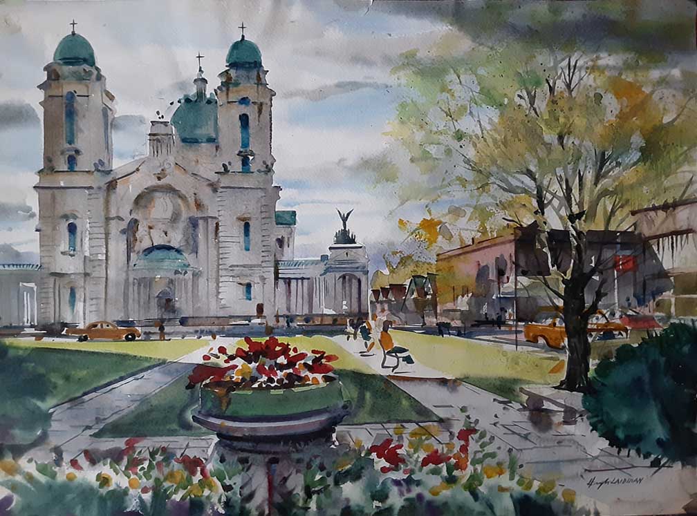 ![]() Postcard ... Note left and right twin colonnandes at corners (detailed at bottom of this page ![]() Watercolor by Hugh Laidman, c. 1975 ... Laidman bio, online March 2021 ... Image courtesy of Jack Edson |