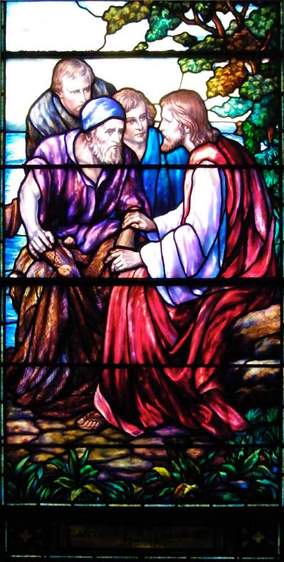 Lower panel - Christ Calling the Fishermen (Upper panel - Angels Playing Lute and Cymbals) Upper left: James; Lower left (with beard): Peter; Beardless apostle: John Luke 5: 10 And so was also James, and John, the sons of Zebedee, which were partners with Simon [Peter]. And Jesus said unto Simon, Fear not; from henceforth thou shalt catch men. 11 And when they had brought their ships to land, they forsook all, and followed him. LARGER SIZE beneath top photo) |