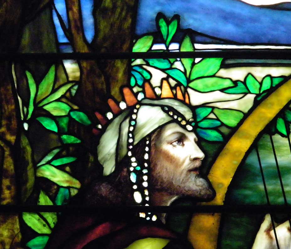 Playing His Harp The jewels in the string of beads on David's crown are actually chunks of glass which were put in place while the base mass was cooling. The strings on his harp are rods of metal attached to the framework of the window itself. LARGER SIZE beneath top photo |
