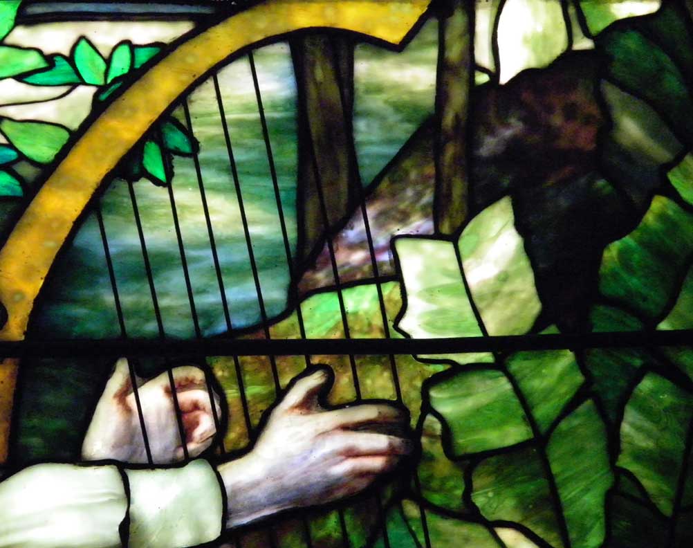 The strings on David's harp are rods of metal attached to the framework of the window itself.