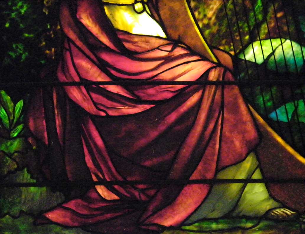 Playing His Harp Note use of opalescent glass. Tiffany achieved great scenic depth in this composition. In order to give this feeling, he keeps all detail in the foreground and minimizes that in the background. LARGER SIZE beneath top photo |
