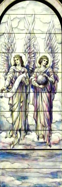 Tiffany Studios watercolor This cartoon hangs in the church narthex. The final design (next photograph) differs from this watercolor. In the finished window, the angel to the right holds a scale, not an orb. Supposedly, Louis C. Tiffany himself made the decision and used his own name, as opposed to Tiffany Studios, in the signature in the lower right of the window. LARGER SIZE beneath top photo |