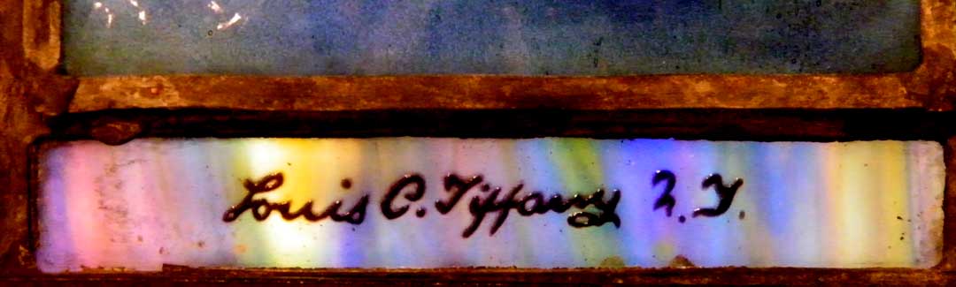 Detail - Lower panel: Come Unto Me Tiffany signature: The final design differs from this watercolor. In the finished window, the angel to the right holds a scale, not an orb. Supposedly, Louis C. Tiffany himself made the decision and used his own name, as opposed to Tiffany Studios, in the signature in the lower right of the window. LARGER SIZE beneath top photo |