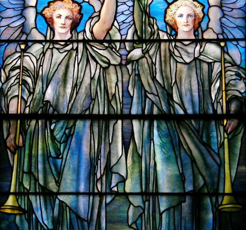 The angel at the left holds a trumpet pointing down and raises on high a gold crown with stars on its points. The angel at the right holds a downward pointing trumpet and iris (usually associated with Mary) leaves .