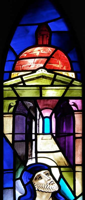 Detail - Malachi The last of the books of the prophets of the Old Testament. Shown in front of the altar of the Temple holding a plate of food intended to be sacrificed to God (Malachi 1:7), in contempt of the Temple priests who were not accepting worthy animal or cereal sacrifices from the people Iconography in Art and Architecture: Malachi LARGER SIZE beneath top photo |