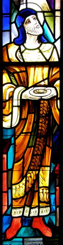 Detail - Malachi The last of the books of the prophets of the Old Testament. Shown in front of the altar of the Temple holding a plate of food intended to be sacrificed to God (Malachi 1:7), in contempt of the Temple priests who were not accepting worthy animal or cereal sacrifices from the people Iconography in Art and Architecture: Malachi LARGER SIZE beneath top photo |