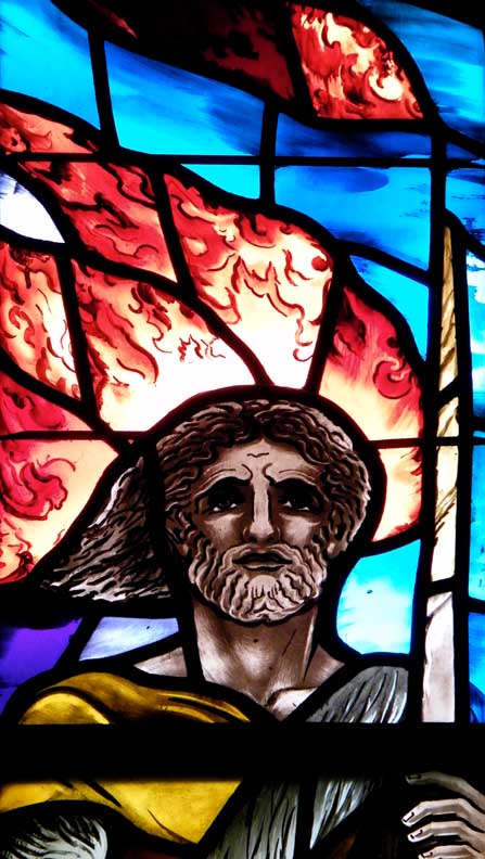 Detail - Elijah The prophet is shown holding a scroll and wearing a cloak "made of animal skins, tied with a leather belt" (2Kings 1:8). The fiery sky shows his going into heaven in a chariot of fire. Iconography in Art and Architecture: Elijah LARGER SIZE beneath top photo |